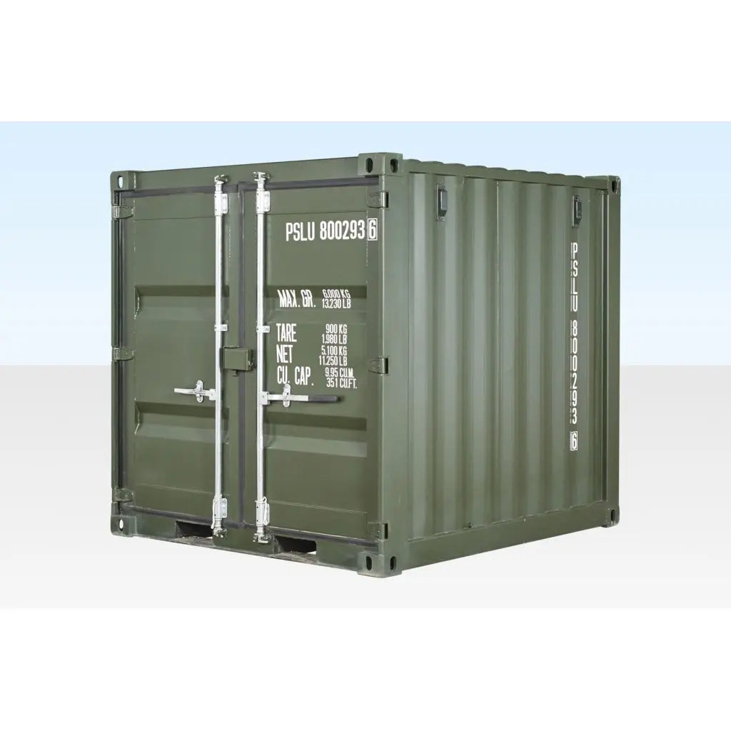 Contentor marítimo de 8 pés para venda (verde). Fabricado na China e utilizado uma vez para enviar mercadorias para o Reino Unido.
